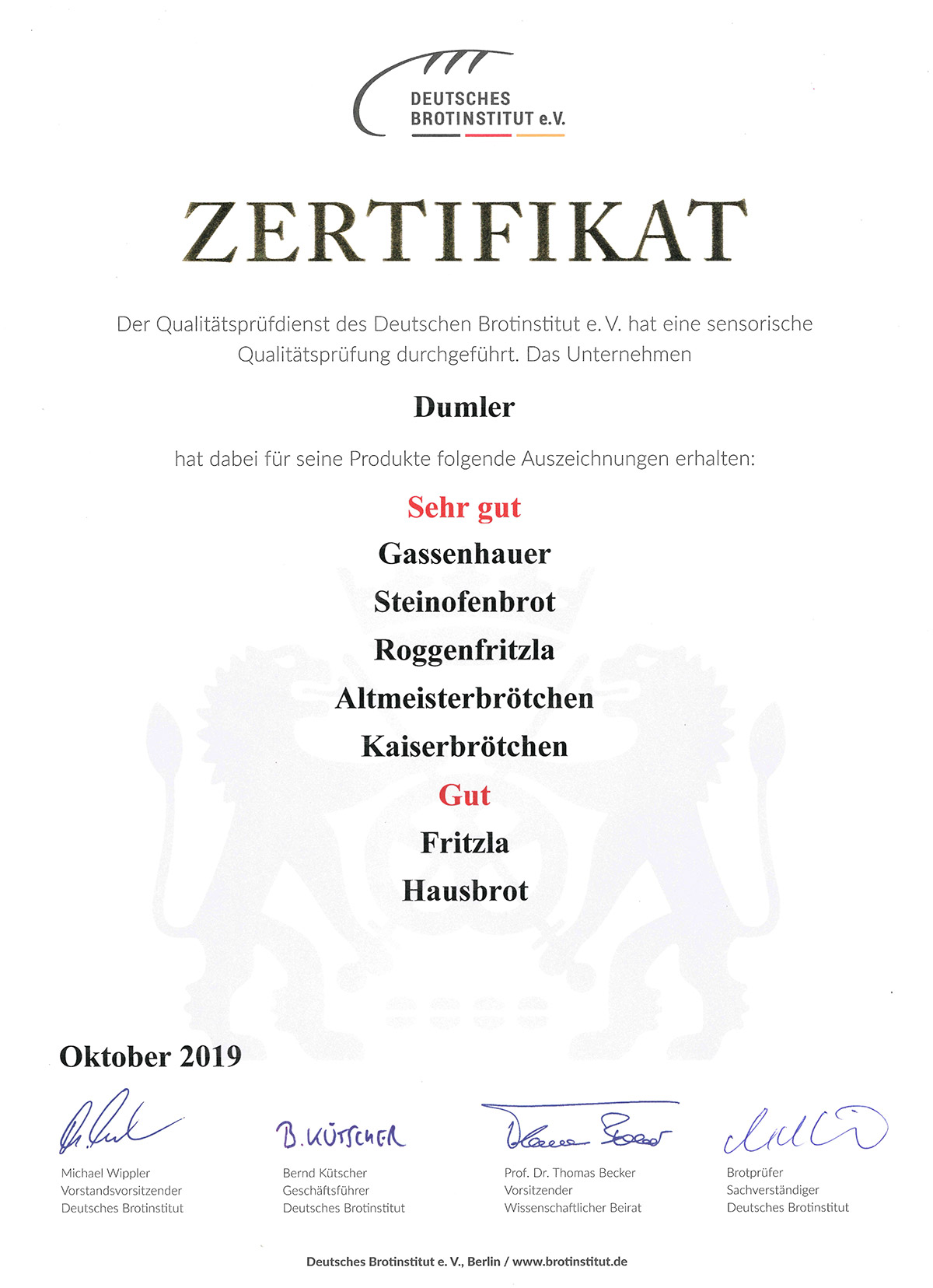 Der Qualitätsprüfdienst des Deutschen Brotinstitut e.V. hat eine sensorische Qualitätsprüfung durchgeführt. Das Unternehmen Dumler hat dabei für seine Produkte Gassenhauer, Steinofenbrot, Roggenfritzla, Altmeisterbrötchen und Kaiserbrötchen die Auszeichnungen sehr gut [...]