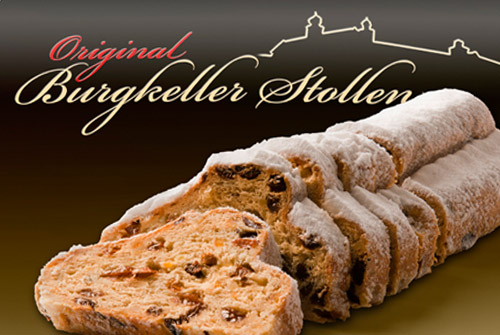 Der fränkischeButterstollen mit Rosinen, ein leckeres Weihnachtsgebäck, wird aus einem schweren Hefefeinteig hergestellt. Das Herstellungs- und Back- und Lagerverfahren, sowie die Rosinen, Zitronat und Orangeat und Mandeln verleihen ihm den typisch saftigen, süßaromatischen Geschmack.